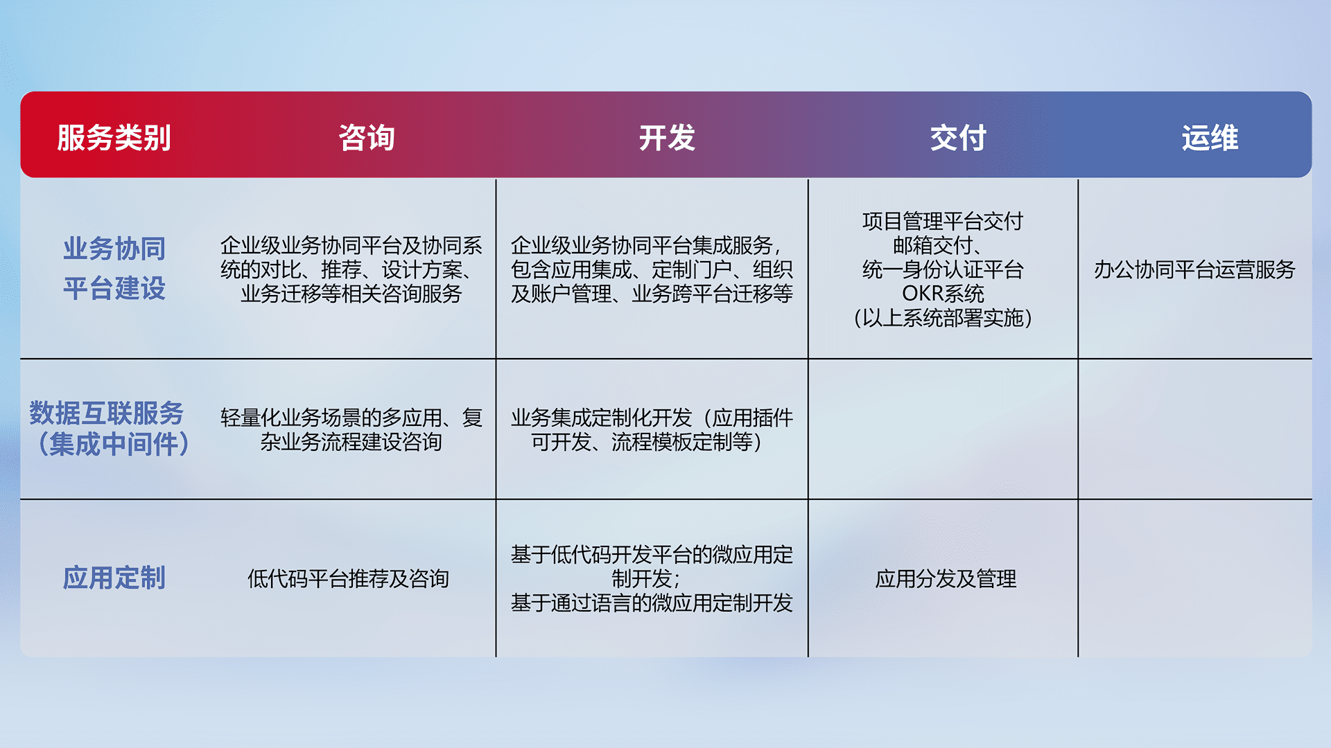 针对钉钉、、、、企微、、、、IDaas等平台级产品提供产品的规划、、、方案、、、交付、、、、定制化开发等服务,,,实现如统一协同办公、、智能客户服务、、、混合会议管理、、智能数据查询、、、、等业务场景,,,实现数字化转型。。。